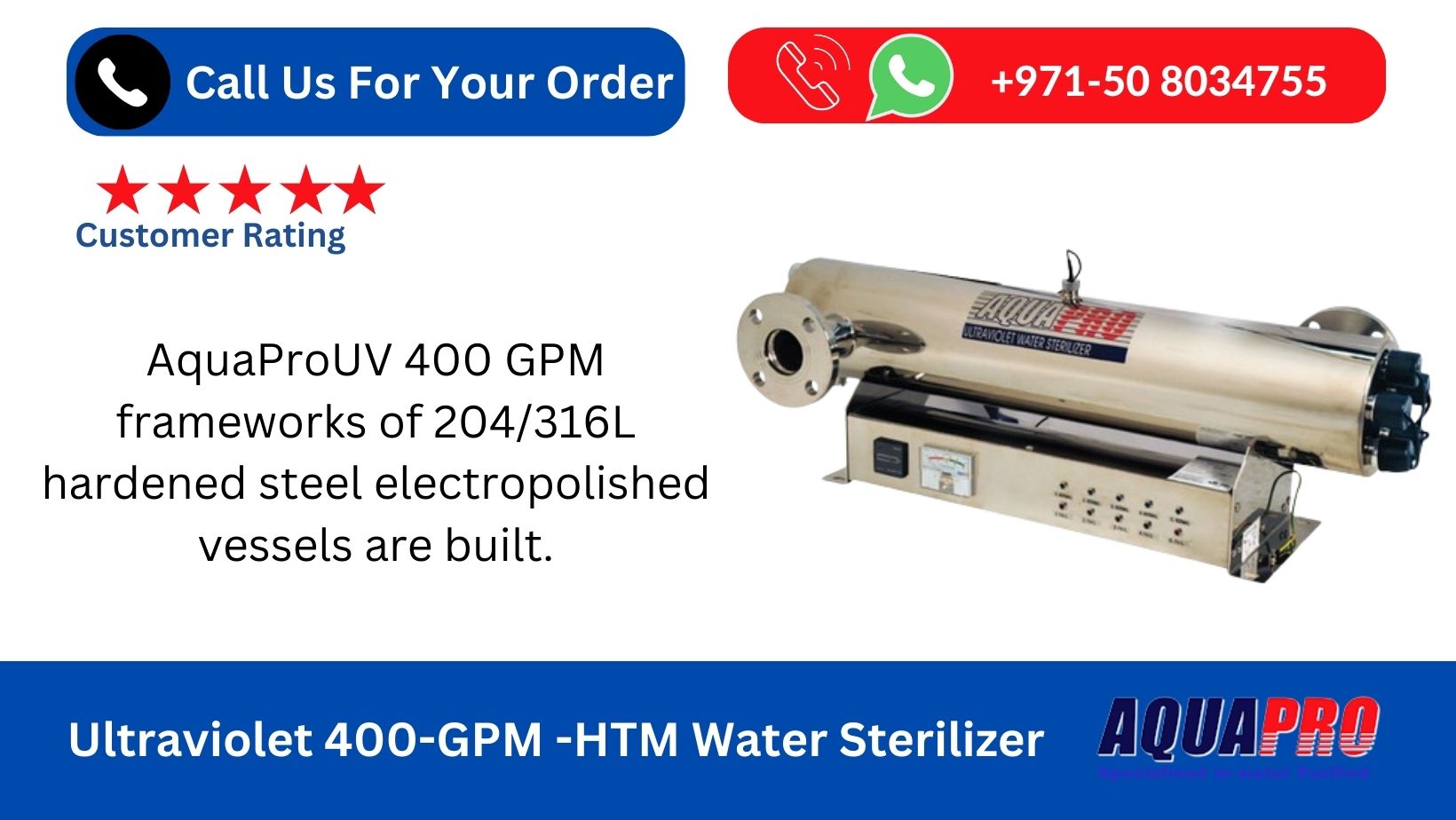 AquaPro Ultraviolet 400-GPM -HTM Water Sterilizer in UAE offer a wide variety of applications for the water treatment industry. AquaPro 400 GPM UV-UV Water Sterilizer Point of Entry (POE) for Home or Industry, Point of Use (POU) for Water Purification such as Reverse Osmosis, Microfiltration, Drinking Water, Food Processing (eg. , medical, processing industry, aquarium, swimming pool, aquaculture, laboratory.